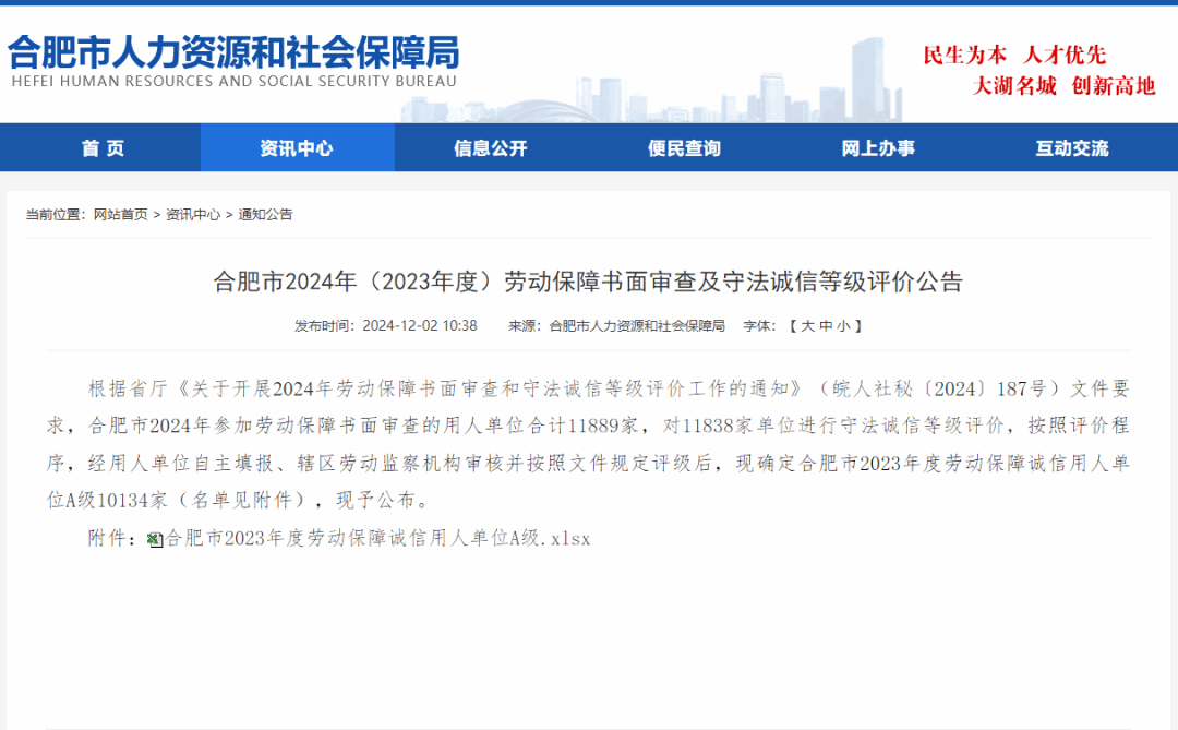 近日,合肥市人力资源和社会保障局下发2023年度劳动保障诚信用人单位等级评价,绿建科技公司获评“合肥市劳动保障诚信A级用人单位”。