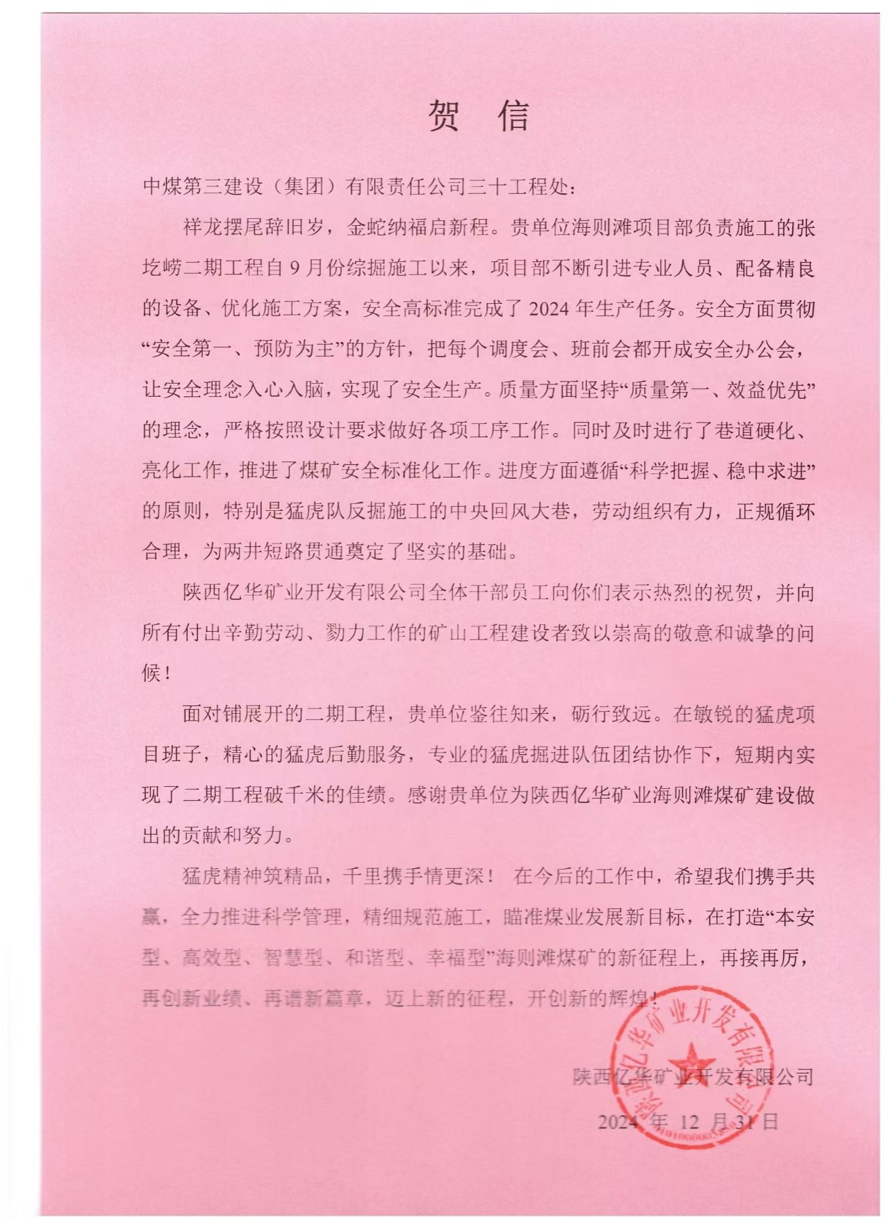 12月31日,陕西亿华矿业开发有限公司向三十工程处发来贺信,对海则滩项目部取得工程佳绩表示祝贺。这也是今年以来该处收到亿华矿业公司的第七封贺信。